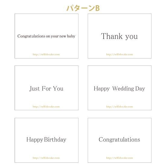 「Happy Birthday」「Thank you」「Congratulations」「Just For You」「Happy Wedding Day」「Congratulations on your new baby」「メッセージ記載なし」の7種類の定型カードをご用意しています。